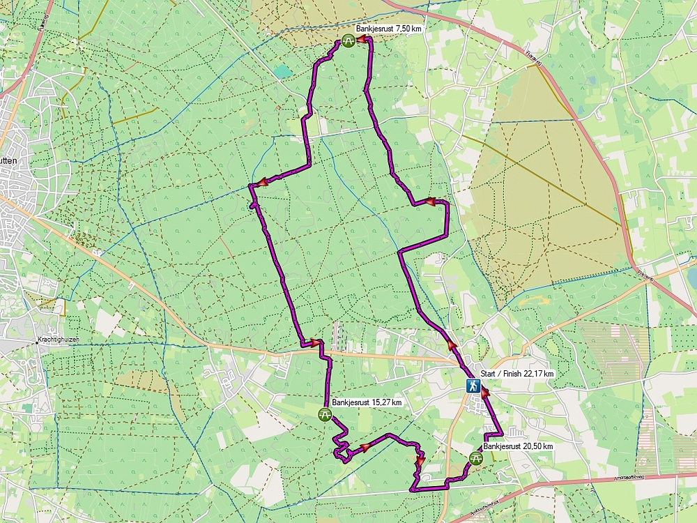 Op Wandelzoekpagina vond ik de Boswandeling Veluwse Malebossen van ca. 20 km. Dat kwam qua afstand prima uit, omdat ik voor de halve marathonafstand had ingeschreven. En uit ervaring weet ik dat de uiteindelijke afstanden altijd wat langer uitvallen. En hoewel ik helemaal geen liefhebber van bossen ben, vind ik de begaanbaarheid van de paden in deze winterse omstandigheden heel erg belangrijk, dus hup, op pad naar Garderen!