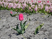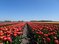 Ik heb een paar weken afgewacht, omdat ze waarschuwden dat de tulpen die op de foto's te zien waren geweest onder plastic hadden gestaan en dus in vroege bloei waren gekomen. Inmiddels waren ze al bezig met het koppen van deze velden. De rest van de tulpen zou zo eind april in bloei komen te staan. Toen ze dus voor Koningsdag een mooie dag met een oranjezonnetje beloofden vond ik de tijd rijp geworden om naar Midwoud af te reizen.