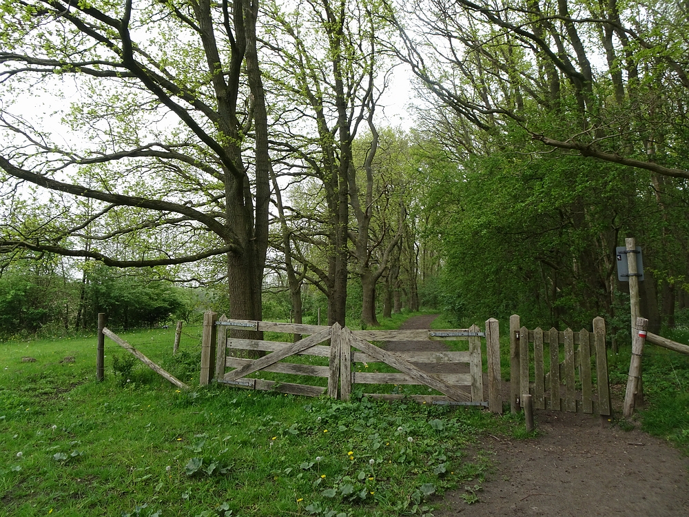 Gelukkig geen lange afstand vandaag, dus we konden ons gemakje ervan nemen en hebben allereerst het kasteel en de prachtig bloeiende blauwe regen bewonderd. Daarna waarschuwde een bord dat de route voor wandelaars afgesloten was en we konden er ook echt niet langs. Hermetisch afgegrendeld. Kijk, op zulk soort momenten ben ik altijd erg blij met m'n GPS, ik kon zien dat helemaal omlopen een eeuwigheid zou gaan duren en dat we met teruglopen sneller terug zouden zijn op de route. En hoewel iedere wandelaar een bloedhekel heeft aan teruglopen hebben we dat nu toch maar gedaan!