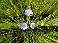 De terugweg gaat over de al genoemde stille weg door de polders. Er staat een groot bord dat het verboden is voor onbevoegden, maar er hangen ook stickers van het wandelnetwerk, dus ik ga er maar van uit dat dit verbod alleen voor auto's geldt. Hoe dan ook, ik geniet van het wandelen tussen de akkers en vind het leuk dat de gewassen die hier verbouwd worden met grote borden vernoemd worden. Zo is er zelfs een heel veld vol ouderwetse vlas, met mooie blauwe bloemetjes.