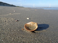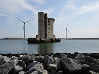 Ze zijn hier overal bezig met windmolens te plaatsen, op sommige plekken zie je goed hoe enorm groot de basis van die dingen is, en bij gebrek aan bankjes drink ik even koffie op de voet van zo'n molen. Om tot de ontdekking te komen dat er om de hoek toch bankjes staan, maar die staan nog niet in de Alle Bankjes app. Ik heb ze dus maar even toegevoegd. Een ommetje over een windmolenpier komt te vervallen, omdat je daar vanwege de bouw van die molens nu niet op mag.