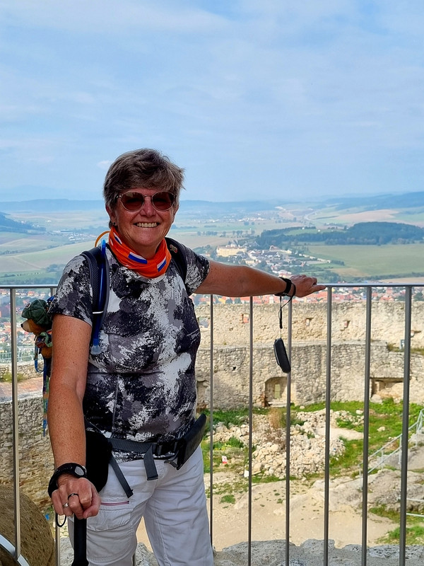 Het eerste stuk gaat buitenlangs, maar dan ga je over hele smalle trappetjes aan de binnenkant verder. Hele hoge treden ook! Op ieder plateautje rust ik even uit en kijk hoe een bak met geldstukken op de begane grond steeds kleiner wordt. Dan komt er een bordje dat de trap nòg smaller wordt en dan ben ik boven. WOW WOW WOW, wat een uitzicht! Het stadje Spisske Kapitula waar ik straks naar toe wil zie je heel diep beneden je liggen en ook de kasteelmuren waar ik straks nog een ommetje op ga maken.