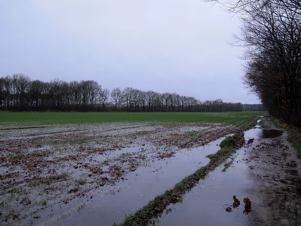 Al vrij snel valt er een bui en wandel ik weer eens onder de paraplu. Gelukkig duurt dit niet al te lang en de rest van de tocht is het droog geweest. Althans, wat hemelwater betreft, de "droogheid" van de wandelpaden hield veel te wensen over. Met andere woorden: het was door- en doornat en blubberig, en er stonden extreem grote plassen!