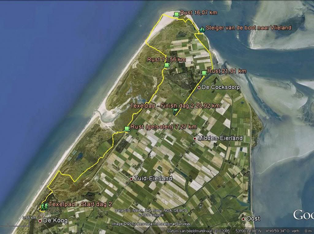 Eindelijk ben ik bij de golfbreker op de punt van Texel en dan moet ik het brede strand over naar de strandtent die daar uitnodigend staat. Of er geen end aan komt, gelukkig is het meeste losse zand weggeblazen en is het strand redelijk hard, anders was het helemaal een ramp geweest. Eindelijk, eindelijk, eindelijk ben ik dan bij de strandtent en hoewel maar 4,5 kilometer verder dan daarnet ga ik toch weer aan de koffie! En m'n schoenen even ontzanden ....