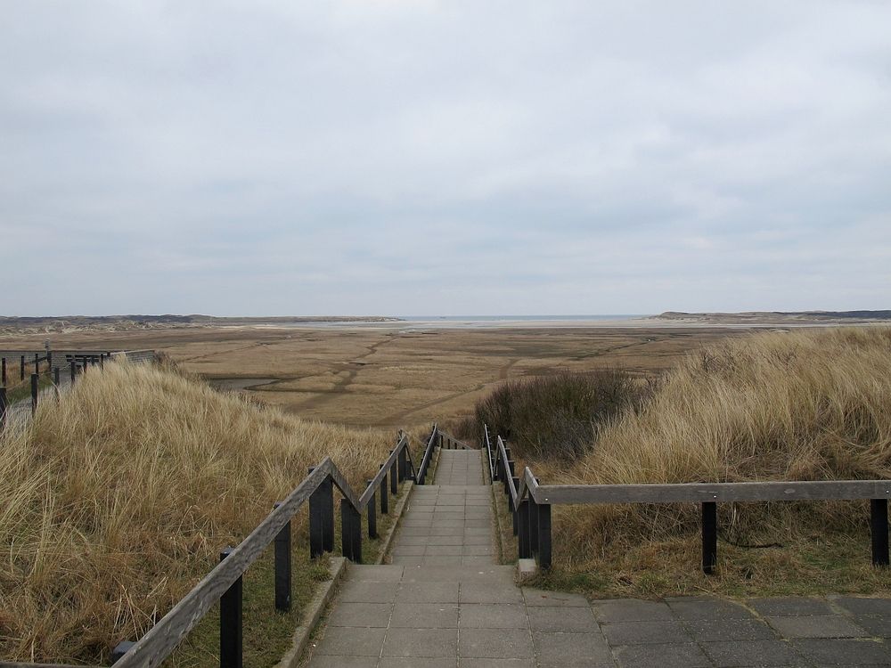 Nadat ik opgewarmd ben en weer even via de social media contact heb gehad met de rest van de wereld ga ik weer verder, nu richting het strand. Ik loop nu met de wind van schuin opzij en over een redelijk verhard pad, eerst beton en later schelpen met een soort versteviging ertussen. Loopt prima. Ook dit pad golft weer door de duinen, dus het is weer best pittig klimmen en dalen vandaag!