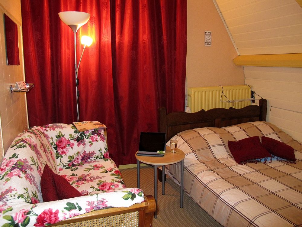 De kamer is boven, met op de overloop een soort zitje. Er zijn nog drie kamers, maar vandaag ben ik de enige gast en heb dus het rijk alleen. Ook hier heb ik WiFi en kan dus online om dit verslag te maken. Alles voor het ontbijt van morgen staat al hierboven, dus ik kan zelf bepalen wanneer ik opsta, ontbijt en vertrek. Prima geregeld! Er zijn drie vriendelijke poezen en een aardige hond in huis, buiten op het erf lopen kippen en in de stallen staan paarden. Leuk adresje weer, heel anders dan gisteren!