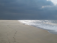 Dan mag ik weer door het mulle zand de duinen over en arriveer voor de derde keer tijdens dit pad op het strand. En dan komt er een wel heel heftig stuk. Ik ben bijna op de uiterste punt van het eiland en moet dus echt pal tegen de wind in. Die giert over een onwijs breed strand en ik word compleet gezandstraald. Om de haverklap moet ik even achterstevoren op adem komen, dus echt opschieten doe ik ook niet. Ik moet naar de vuurtoren die een eindje verderop staat en die lijkt maar niet dichterbij te komen.