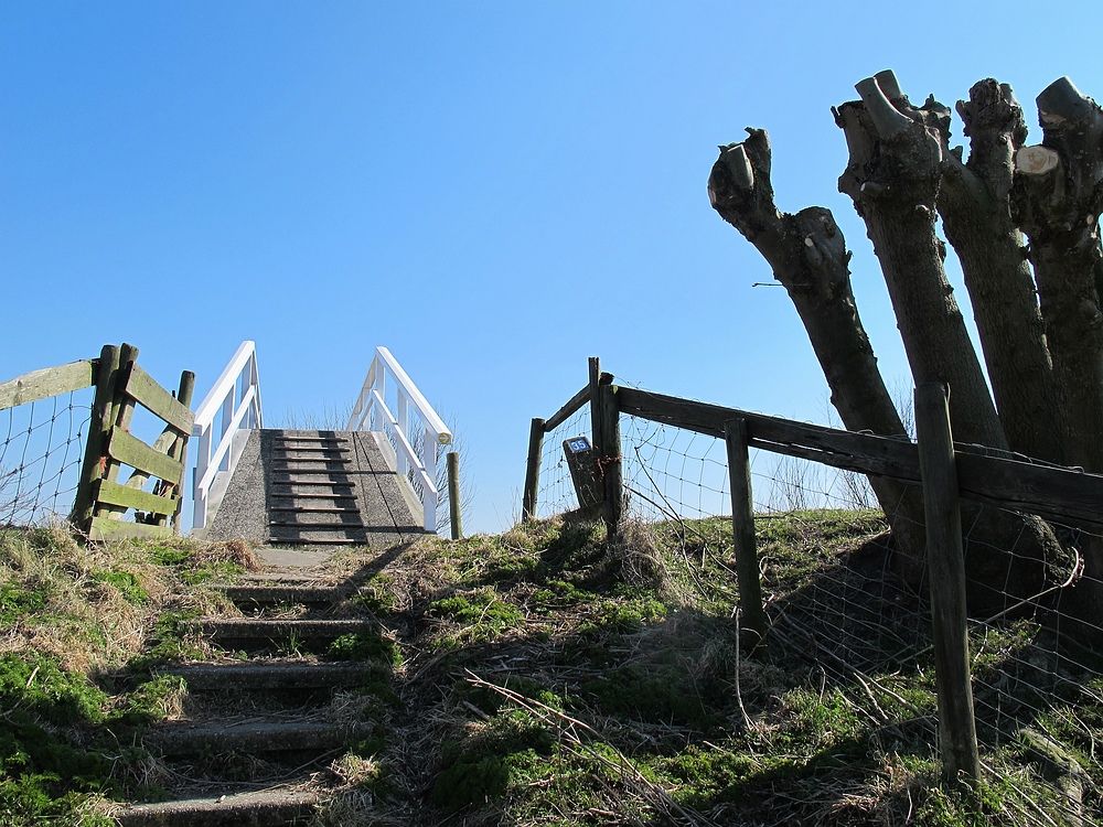 Ik heb wat moeite om het begin van het pad te vinden, maar gelukkig weet een groepje na mij komende mannen precies waar ze heen moeten. En ja hoor, na een stukje dwars door het weiland is daar een heel smal paadje. Het lijkt eindeloos door de weilanden te gaan. links, rechts, bruggetje en weer links en rechts!