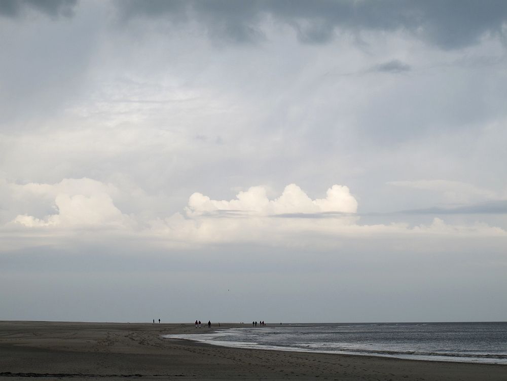 We gaan direct de duinen over naar het strand, een stevige klim, maar eenmaal op het strand is het genieten van de wind en een prachtige donkere lucht. Ik vind de wind in het begin nogal meevallen, het lijkt wel of ie van schuin achter komt, maar als we wat verder zijn draait hij blijkbaar en krijgen we hem steeds meer van voren.