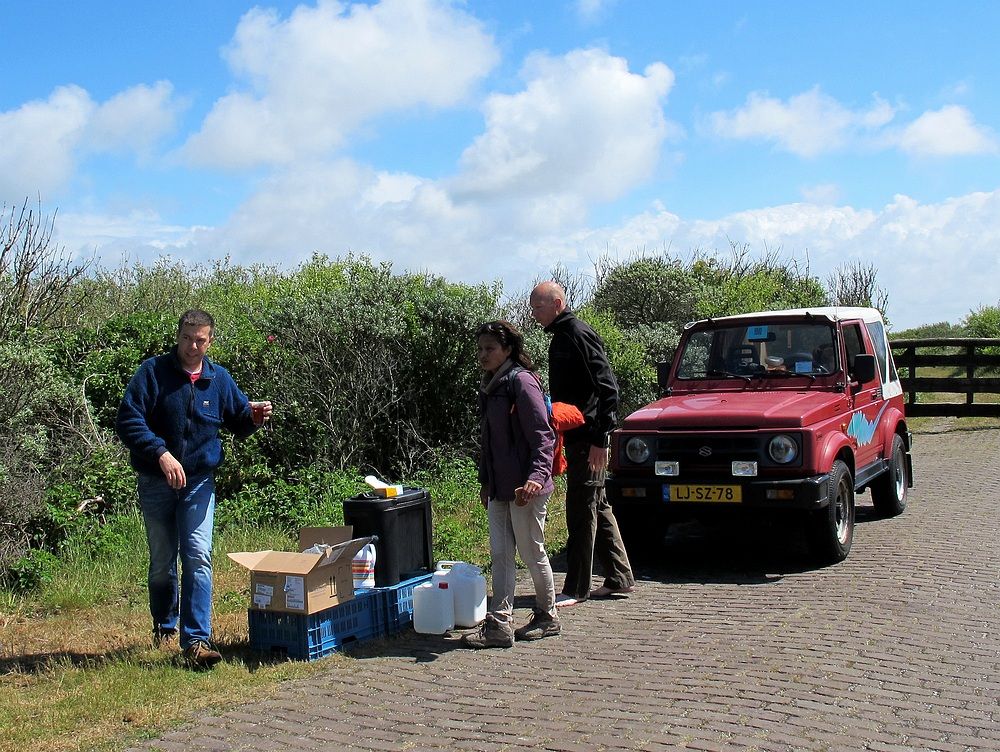 Ik deel een paar kaartjes uit en maak een praatje met een paar mensen, van één vrouw hoor ik dat ze al vaker op m'n site is geweest, leuk! Ook maak ik een babbeltje met een bekende van het eiland: Folkert, de vroegere chauffeur van de Vliehors Express. Er is ook een man met een hond, die zat gisteren naast me op de boot, hij logeert in hetzelfde hotel en nu komen we elkaar hier weer tegen, grappig!