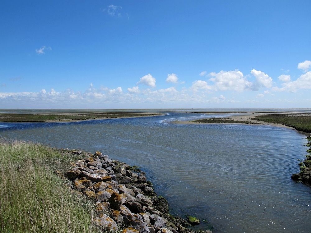En dan vliegen we inderdaad met een noodgang over de Postweg naar het dorp! Soms moet ik me echt een beetje inhouden, anders ga ik in een looppas over. Het eerste deel van de Postweg loop je een beetje in het land, maar later kom je langs het wad te lopen en ik heb nog nooit zulke grote witte koppen op de Waddenzee gezien! Tjonge jonge, het is echt een zomerstorm!