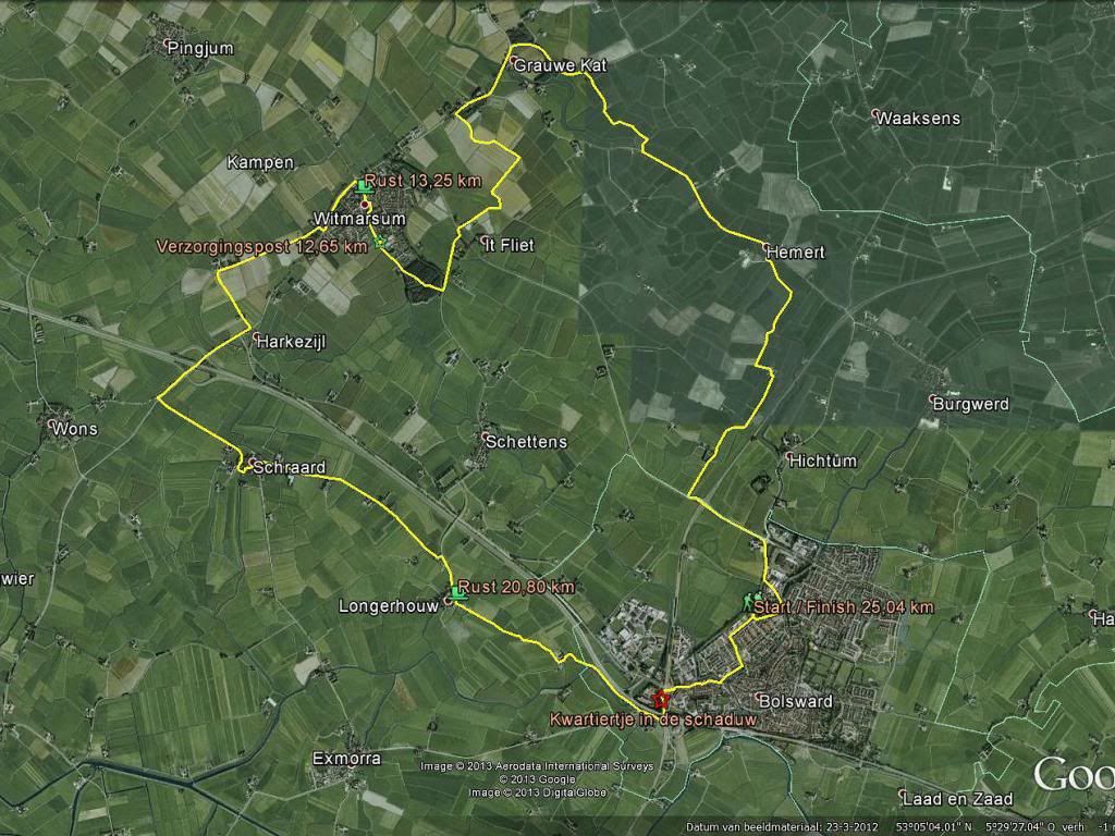 Vlak voor Witmarsum zat er een klein stukje nieuw parcours in de 25 km, waardoor de eerste verzorgingspost wat verder weg zat. Later op de route verviel er een stuk zodat de totale lengte beter uit zou komen. Dat mocht ook wel, verleden jaar stond GPS pas stil op bijna 29 km! Vlak voor Witmarsum een klein stukje bos dat je ook loopt met de Elfstedentocht en dan is daar de molen met een verzorgingspost.