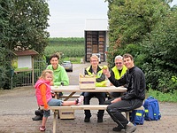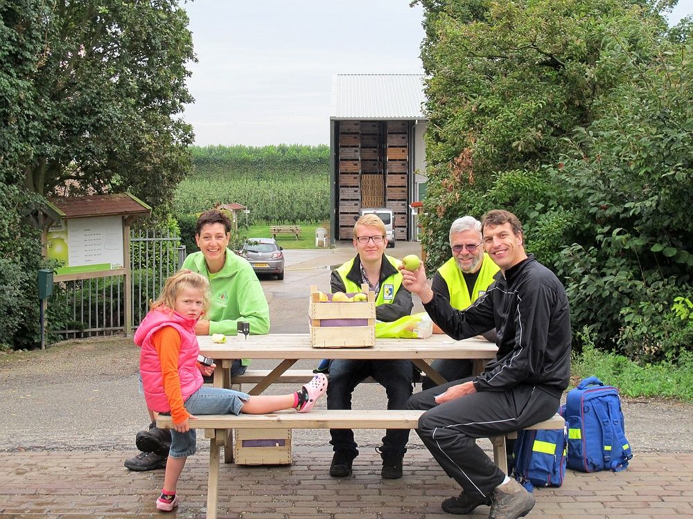 | Na ca. 3 kilometer was er een appeltjespost bij de boomgaard van Roks Streekwinkel. Bij een grote picknickbank werden er appeltjes uitgedeeld en desgewenst kon je dus ook even zitten. Maar daar had ik na drie kilometer natuurlijk nog geen behoefte aan. Wel heb ik hier al m'n jasje uitgetrokken, dat had ik voor de zekerheid meegenomen, maar ik heb het eigenlijk niet nodig gehad. |