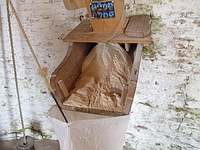 Terug bij de rust blijkt dat ze er pannenkoeken staan te bakken. Dat ziet er erg lekker uit en alweer voor het weggeefprijsje van 50 cent neem ik een pannenkoek met stroop en kaneelsuiker. Op mijn vraag of de pannenkoek is gebakken van meel dat door deze molen zelf is gemalen, wordt bevestigend geantwoord en men spoort me aan om boven even een kijkje te nemen, want er wordt op dit ogenblik gemalen.