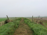 Dan gaat het een werkelijk eindeloos lijkend graspad op. Dit pad is particulier bezit, maar wel opengesteld voor wandelaars. Gelukkig is het gras gemaaid, zodat m'n voeten niet zo nat worden, maar wel hangen er om de haverklap grote grasbalen aan m'n voeten. Vreselijk vermoeiend lopen, maar het uitzicht alle kanten op vergoedt veel!