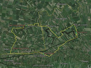 In Hulst verlaat ik de route van de GPS track en ga de rondwandeling volgen die ik ook ergens op internet heb gevonden. Op een Belgische site nota bene, een rondwandeling van ca. 3 km met een leuke beschrijving van alles wat je tegenkomt. Het is nog steeds droog, maar helaas heeft de zon het niet van de wolken gewonnen en is het nu wel betrokken.