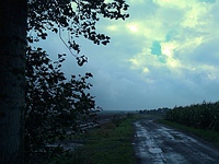 Op een gegeven moment wordt de lucht voor me helemaal blauw en begint de zon fel te schijnen. Heerlijk, maar als ik achter me kijk, zie ik daar een pikzwarte lucht aankomen! Oei, ik ben bang dat ik het niet droog hou en ja hoor, even later komt plensbui nummer twee naar beneden. Gelukkig waait het niet erg hard, zodat ik met de paraplu verder kan en redelijk droog blijf. Omdat het toch behoorlijk koud zou worden vandaag, heb ik m'n nieuwe jasje aan en dat blijkt prima waterdicht te zijn.