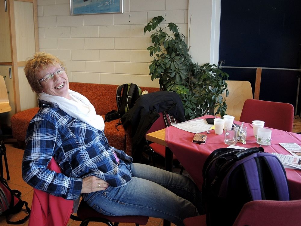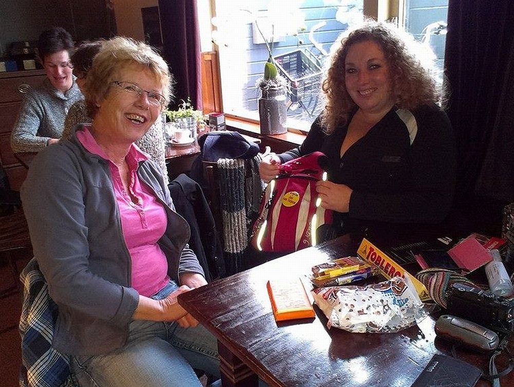 Terug in het startbureau krijgen we als beloning een vaantje aangeboden en mogen we kiezen uit drie kleuren, Wilma neemt een blauwe, ikke een gele en Sunny wil helemaal geen vaantje. Dan bieren we nog even gezellig na met z'n drieën en genieten van een portie heerlijke bitterballen en ander lekkers. Een gezellig toggie van wel "15 heule kilometers" zit er weer op!