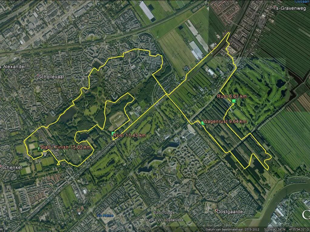 Na de wagenrust gaat het wat meer de polders in, waar ik natuurlijk volop loop te genieten. Op de golfbaan waar we langs komen zijn ze druk aan het golfen en er zitten ook vissers langs de kant. Uiteindelijk komen we uit in Krimpen aan de Lek, waar de nieuwe rust in Het Sportcafé zit. Routebouwer Theo komt me achterop fietsen en gezamenlijk leggen we de laatste meters naar de rust af.