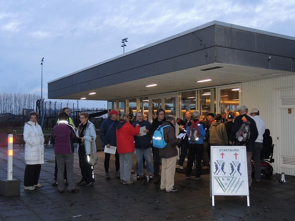 Bij het startbureau is het al aardig druk en ik schrijf me gauw in. Na natuurlijk de wandelboekplaatjes afgeleverd te hebben bij Julia, die de Sportiek tegenwoordig beheert. Zoals gewoonlijk is het onwijs gezellig, toch leuk om bij je eigen vereniging te wandelen! Het wordt zó druk in het startbureau dat Gijs al heel vroeg (08.40 uur) het sein tot vertrekken geeft.