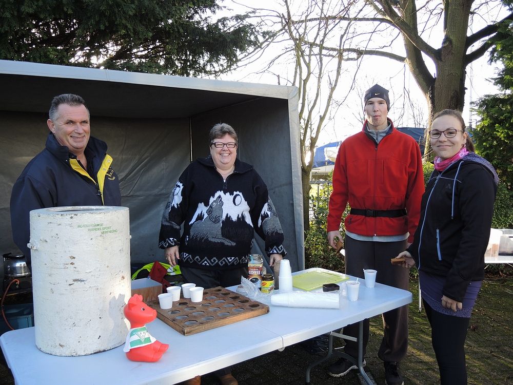 Op de rust aangekomen laat ik me een lekker bakje soep inschenken en ga ik uiteraard ook weer aan het RWV-gebak. Vreemde combinatie, tomaten-groentesoep met ontbijtkoek, maar tijdens een wandeltocht is dat gek genoeg best lekker! Even later arriveren ook Loes en Wilfried en opa Gijs wandelt trots met kleindochter Marit een rondje over de parkeerplaats.