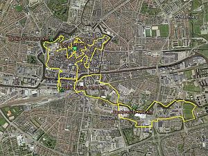 Even was er een beetje paniek. Toen ik bij de Jacobijnerkerk was sloeg opeens m'n GPS op hol. Voor m'n ogen schoot de GPS-track alle kanten op over m'n schermpje en binnen de kortste keren had ik een 5 km extra "gelopen". Gauw de GPS uitgezet en weer opnieuw aan. Na nog twee uitschieters kwam m'n schermpje tot bedaren, maar door alle lijntjes die er nu stonden, was ik even het spoor bijster en wist ik niet welke straat ik in moest. Er stond ook nergens een straatnaam en toen ik twee politieagenten zag lopen besloot ik hen even naar de weg te vragen.