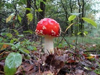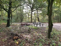 Ik steek de A73 weer over en dan ga ik de Overloonse Duinen in, veel bos en hei dus, maar omdat dit natuurlijk een fietsroute is, loop ik lekker op het asfalt. Als ik zie hoe nat sommige bospaden eruitzien, ben ik daar helemaal niet rouwig om . Helaas begint het wel weer te regenen, jammer, het bos wordt er wel erg somber door en m'n knalroze plu is zo'n beetje de enige felle kleur die je ziet.