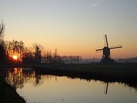De start was helemaal aan de buitenkant van Schoonhoven en ik zag de hemel al rood kleuren, daar waar de zon zo op zou komen. Maar eerst liep ik richting een molen, bij Bon Repas, en die zag er uit als een pláátje aan de overkant van een rimpelloos watertje. Want vandaag was niet alleen zonnig en koud, maar ook nog eens nagenoeg windstil! En ja hoor, daar was de zon, achter een bomenrij zag ik hem boven de horizon uitkomen.