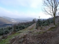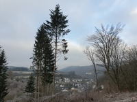 Na een avontuurlijk stukje over een Höhlweg kwam ik bij een skigebiedje uit, waar niet geskied werd, maar waar mountainbikers zich omhoog lieten trekken door de skiliften om zich daarna met ware doodsverachting van de berg af te storten. Dit was zo'n beetje het hoogste punt dat ik in deze 4 dagen bereikt heb, GPS stond op 600 en ging daar zelfs even overheen. Nog een stukje droomlaantje met witberijpte bomen volgde en toen kwam de aftakking van het Sonnenpfad richting Oberveischede.