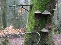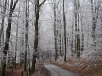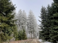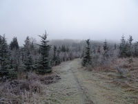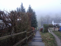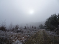 Maar uiteindelijk werd al dat klimmen beloond, het was mistig weer en toen ik hoog genoeg was gekomen zorgde die mist voor schitterende rijp op de bomen en struiken. Tjonge, jonge, het leek wel of ik in een sprookje rondwandelde en m'n camera maakte overuren natuurlijk! Uiteindelijk arriveerde ik bij de Hoge Bracht, daar kon ik een rondje maken naar een uitkijktoren, maar ik vond dat ik wel genoeg geklommen had en ben gelijk overgestapt op de route van het Sonnenpfad.