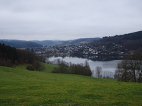 Maar de afdaling aan deze kant betekende wel dat ik aan de andere kant weer omhoog moest en al gauw zag ik de Biggesee weer diep onder me. En daar op een punt met een prachtig uitzicht heb ik een bankjesrust ingelast en een kopje koffie uit de thermos gedaan. Niet al te lang blijven zitten, want het is behoorlijk koud. Genietend van het open landschap waar ik nu loop, ga ik weer verder, maar kom even verderop toch weer in donkere bossen terecht.