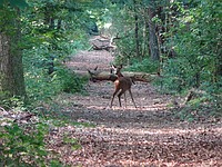 Dan kom ik tot mijn schrik bij een grote zandvlakte, ik hoopte er langs te mogen, maar nee, ik moest er (natuurlijk) dwars overheen, dus ik loop al mopperend door het mulle zand te ploeteren. Er staat hier ook veel hei en hoewel de bloei nu over z'n hoogtepunt is, zijn er toch nog mooi paarse plekjes te vinden. Gelukkig is het stukje door het zand niet al te lang, ik ga het bos weer in en word verrast door een beweging wat verderop.