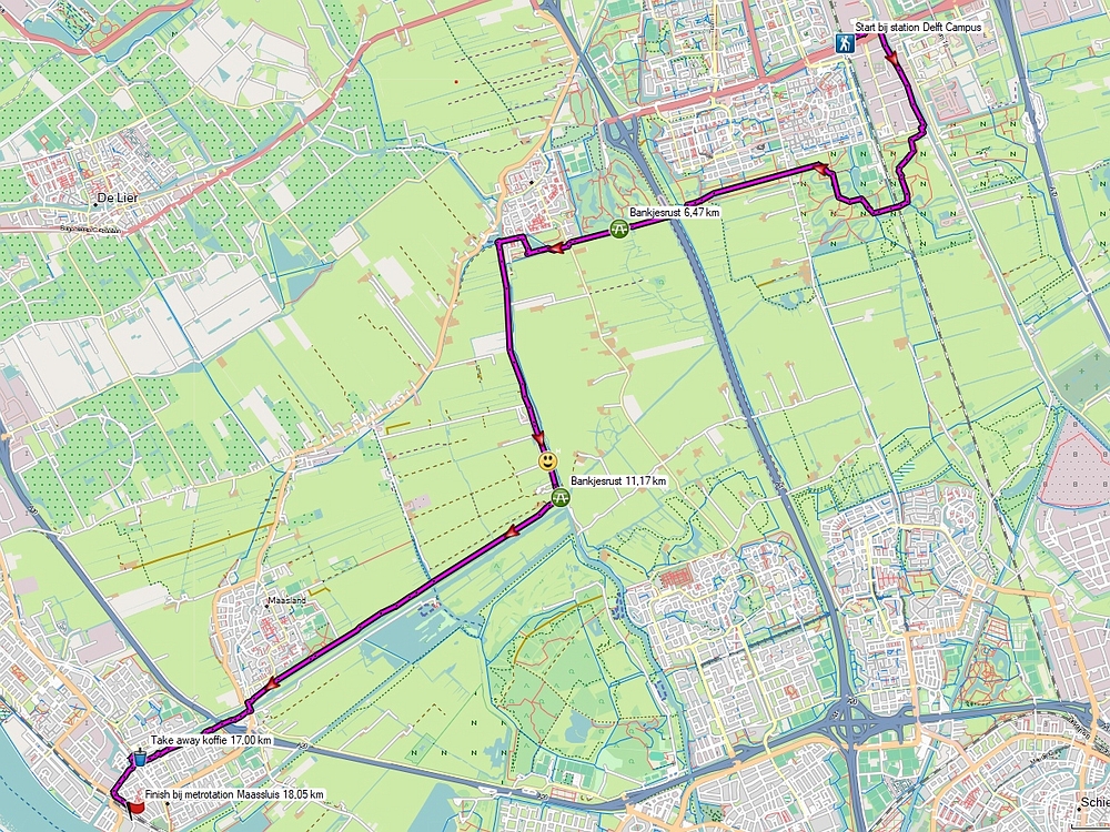 Het eerste stukje van de route leidde oorspronkelijk door de woonwijk Delft-Zuid, en ik heb toevallig een verschrikkelijke hekel aan het wandelen door woonwijken, dus ik had met behulp van Basecamp de route een stukje omgelegd door het Abtswoudse Bos. De afstand werd daardoor wel iets langer, maar bleef nog netjes onder de 20 km die ik mezelf met m'n beenblessure als grens heb gesteld. Uiteindelijk bleken het 18 km te zijn.