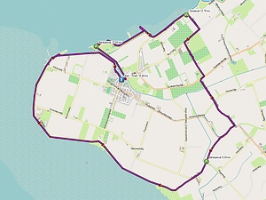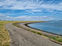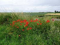 Een andere leuke ontmoeting was met een enorme hond, het leek wel een kruising tussen een Sint Bernhard en een Rottweiler! Hij kwam met een noodgang op me af rennen en aan de manier waarop kon ik direct zien dat het een grote goedaardige lobbes was. Ik was alleen als de dood dat ie ging springen! Gelukkig deed hij dat niet, maar voor de rest vond ie àlles leuk, m'n stok, m'n routebeschrijving, m'n GPS....... Ik kwam amper meer vooruit met dat bakbeest voor m'n voeten en probeerde het met een ferm uitgesproken "ZIT". Prima, geen probleem voor mister hond, hij zat. Maar WOW, toen waren de veters in mijn schoenen weer geweldig interessant, hij lag compleet voor m'n voeten te kronkelen. Eigenlijk was het net Timmie, alleen ietsiepietsie groter. Net toen ik hem op de foto wilde zetten, kwamen we langs de oprit naar zijn huis en daar werd hij geroepen door de baas. Weg hond, geen foto dus.